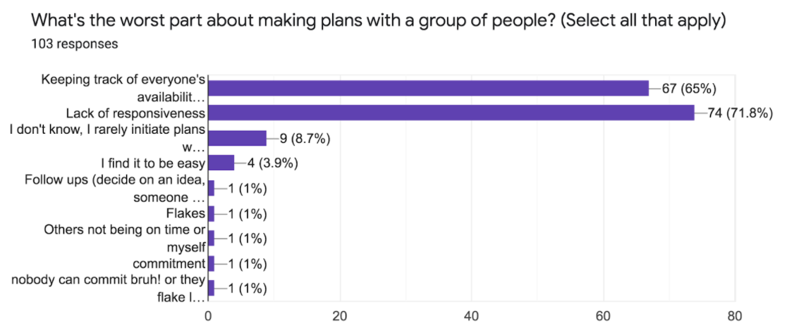 The survey confirmed that the majority of people also have trouble making plans (only 4 people found it to be easy). Most people said that the worst part about making plans was keeping track of availabilities and a lack of responsiveness.